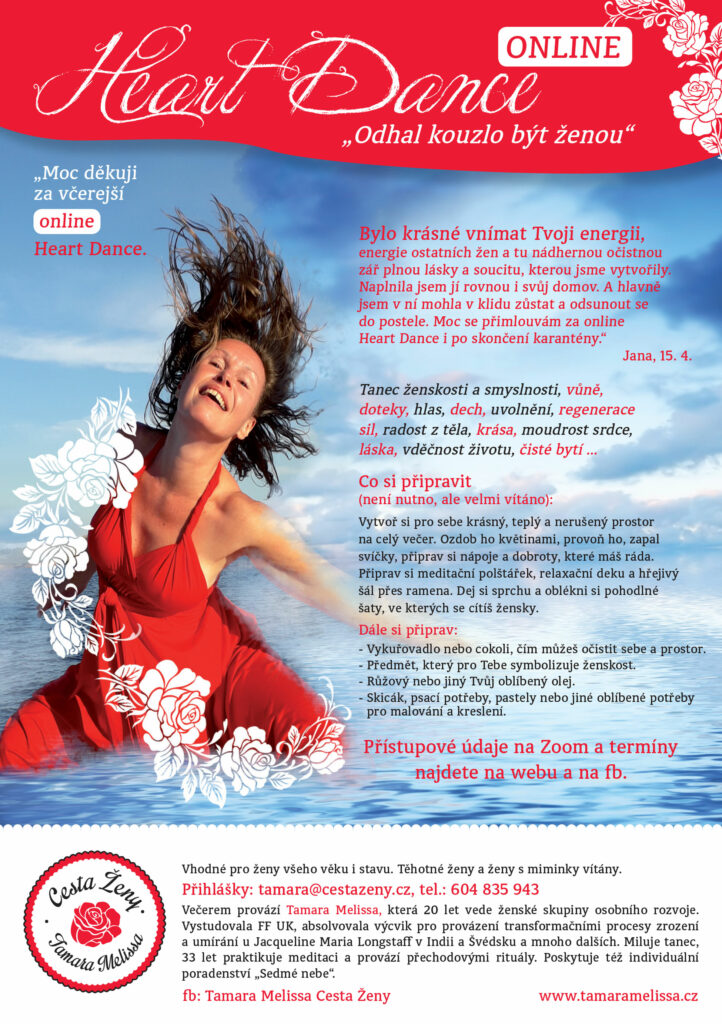 Už s tím mám výbornou zkušenost, nemusíte mít obavy, že to nebude fungovat, náš niterný svět je stejně reálný a energie funguje bez ohledu na vzdálenost mezi námi 🙂 Sdílení a ženská podpora, relaxace, uzemění, zazdrojování, spojení se sebou, tanec ženskosti a smyslnosti, vůně, hlas, dech, uvolnění, regenerace sil, radost z těla, krása, moudrost srdce, láska, vděčnost životu, důvěra, čisté bytí. Slovy jedné z účastnic prvního jarního online Heart Dance:”Moc dekuji za vcerejsi online Heart Dance. Bylo krasne vnimat Tvoji energii, energie ostatnich zen a tu nadhernou ocistnou zar plnou lasky a soucitu, kterou jsme vytvorily. Naplnila jsem ji rovnou i svuj domov. A hlavne jsem v ni mohla v klidu zustat a odsunout se do postele. Moc se primlouvam za online Heart Dance i po skonceni karanteny.” Jana, 15.4. Budu ráda, když si tento večer rezervujte pro sebe a vytvoříte si soukromí.Do Zoom meetingu se bude možno připojit a ladit technické detaily v cca 18.30 h.S programem začneme v 19 h, kdy bude místnost uzavřena, další připojování nebude možné.Připojte se, prosím, včas!